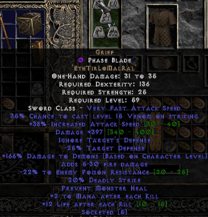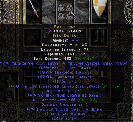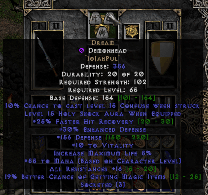 Deamになっていますが、これはHellクリアしてから変更しました。それまではGullaumes Faceをボス戦などはこっちのほうがCrushing Blowがあるので付け替えたりしています。更に防御を上げたい場合にはCrown of Agesも良いかもしれませんがSocket(2)とか出ないですものね。