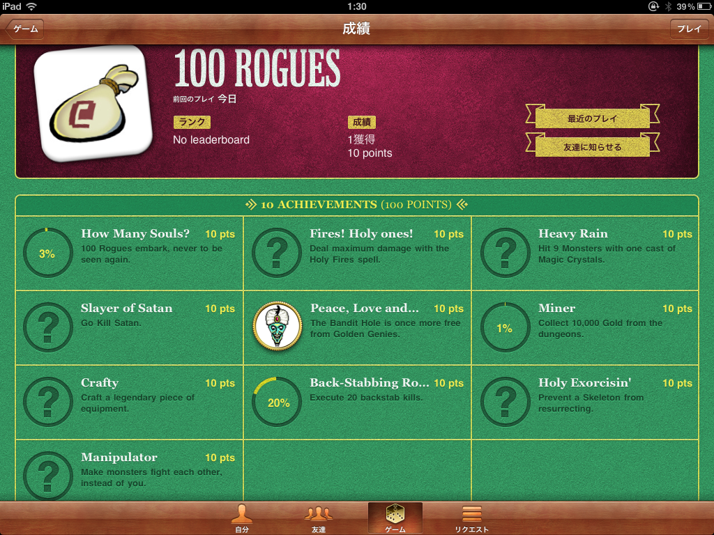 今回のGameCenterは、ハマるための目玉商品。バッチを揃えていく系で条件は結構厳しいものばかり地道に行きたい。内容は具体的には書いていないのだがとりあえず100回しないと最初の" How Many Souls" は貰えないとはさすが「100」Rogues。