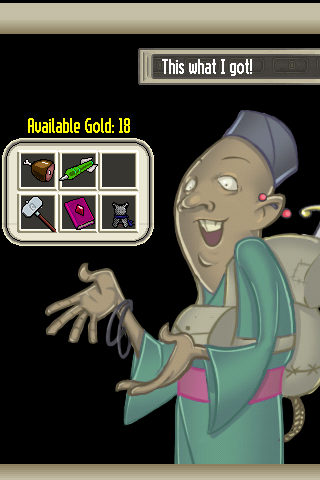 アイテムを購入することが出来る。世の中銭だ、敵を倒すとお金を奪うことが出来る(たまにアイテムとしても落ちている、金を持っているのは人だ。)食料を買える可能性もあり。 IMG_0642 - ポーション(黄色)とか、毒のナイフとかもろもろアイテムが増えている。