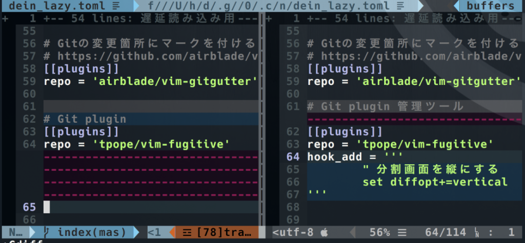 マーク付いてくれるだけで便利です。次の変更箇所には ]c[c でジャンプすることが出来ます。