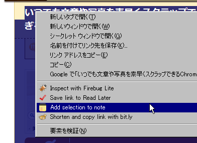 資料のネタどりをするうえで、記事をメモしたい箇所を「選択」した状態で右ボタンを押すと「Add selection to note」という項目がでるのでこれをクリックするとノートがクリップされます。
