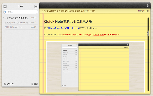 どうでしょう?これで好きな画像とか欲しい物とかクリップしたら便利です。仕事で資料を書くときにその場で必要な項目を一瞥するためにもこの機能でクリップしたりしながら下書きをしています。Diigoと連動することも便利なのですが単体でも有効に使えます。 またMacではネイティブアプリとして ▼ Quick Note on the Mac App Store (  http://itunes.apple.com/us/app/quick-note/id414848186?mt=12&ls=1# ) もあります。