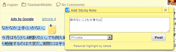 このQuickNoteですがいくつかの素晴らしい機能があります。それは、オンラインブックマーク(ソーシャルブックマーク)のDiigoと連動するということです。これは 「はてなブックマーク」とか「Delicious」とかと同様のサービスです。色々なことが出来るのですがこれの「Notes」とこのQuickNoteは連動して動きます。(Diigo経由でノートも同期出来るので複数台のPCでメモを共有するのもいい感じです・あくまでプライバシー的には問題ない範囲で行う必要があるでしょう、ディフォルトで「Private」で保存はされてはいますが)