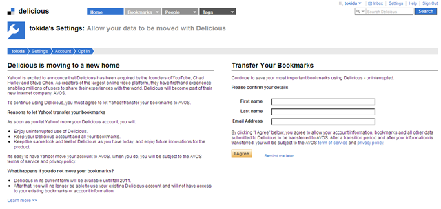 - https://secure.delicious.com/settings/optin からログインします - ログインすると以下の画面が出ますので、UserName等を記入してサブミットします。