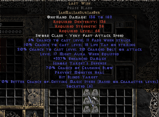 弓アマの様に取っておいたのだが全くベースアイテムが出ないので諦めてこちらを作ってしまった。可変値Crashing BlowがMax70%!パラとしてはもうこれ以上はないのだけど実際につかてみるとそれほど無双ってわけじゃない。マナ吸いがないためか速度が遅くなったためかヒットもしてない気が(Smitなのでそれはないと思うが)、なのでCBは十分にあるので装備を修正しなければならなそうだ。