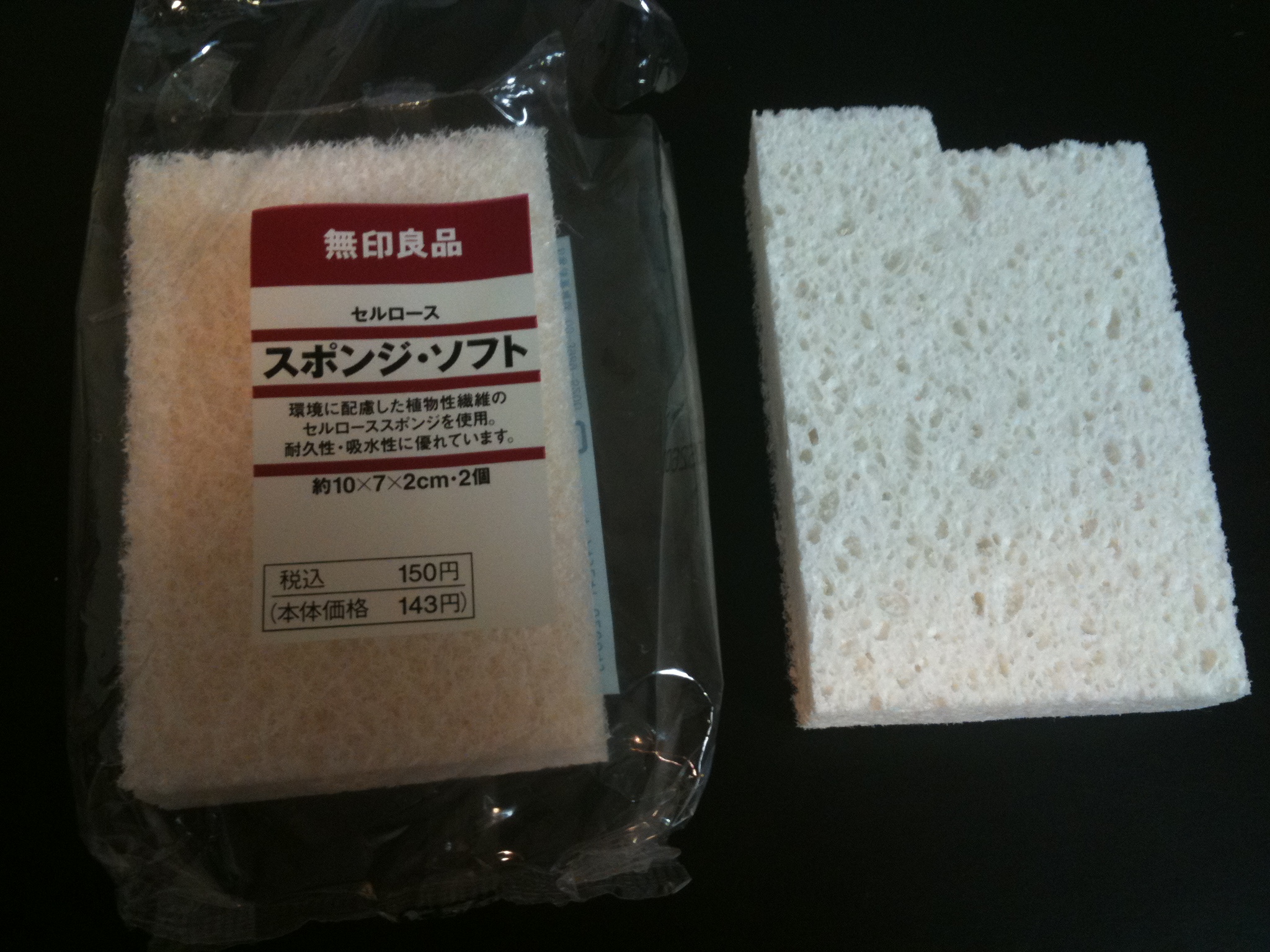 肝心の先端ですが、ICチップなどの放電用の電導性スポンジを手に入れるのは難しそうでしたのでセルロース製の洗濯スポンジを使ってみました。これは無印良品で150円で購入したものです。この量でいったいなんこのペン先を作れるのかというほどですがw