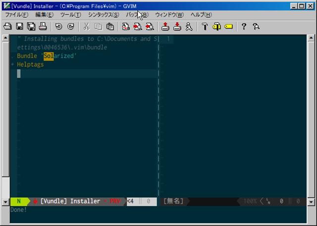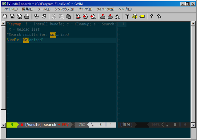 これでダウンロードできますのであとは _vimrc などに「Bundle ‘Solarized’」を記載しておきましょう。