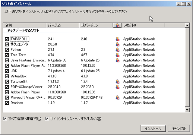 先日、こちらの記事でこの悩ましい問題を解決してくれるソフトを見つけることが出来ました。「AppliStation」です。このアプリは管理されているアプリの導入と、既存に導入されているアプリのアップデートをすることができます。非常に嬉しいのはアプリケーション(EXE)だけでなくDLLなども対象にしてくれているところでしょうか。