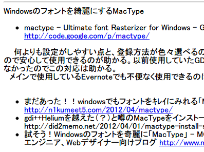 メインで使用しているChormeやEvernoteでも不便なく(重くなく)使用できるのはありがたい。Windowsを使用していてフォントがなぁと思っている人は是非入れてみてほしいなと思う。